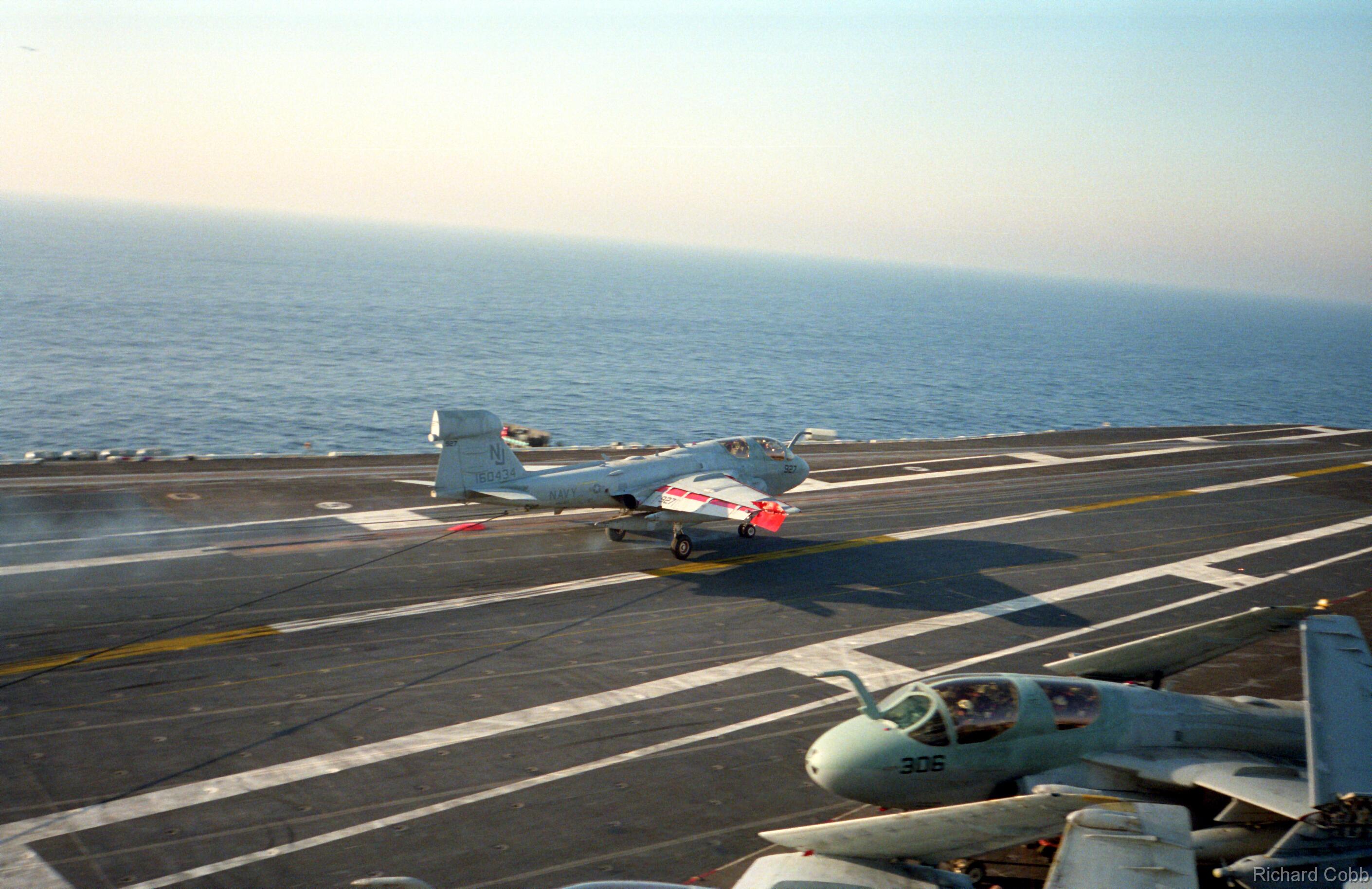 The hook has grabbed a cable - the hook is horizontal and the cable is stretched out behind it, being pulled out of the Arresting Engines which increase force until the plane stops. Meanwhile, the pilot has gone to full throttle as soon as his wheels hit the deck, in case he misses a cable and has to fly off again.
