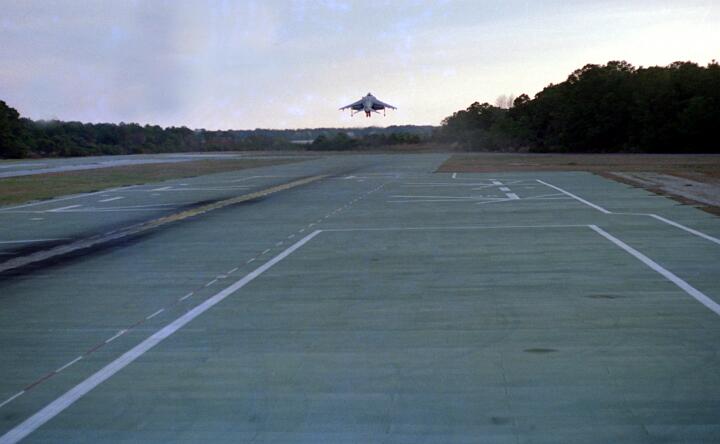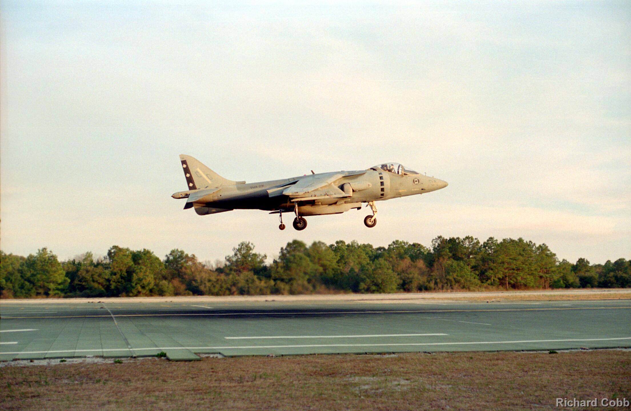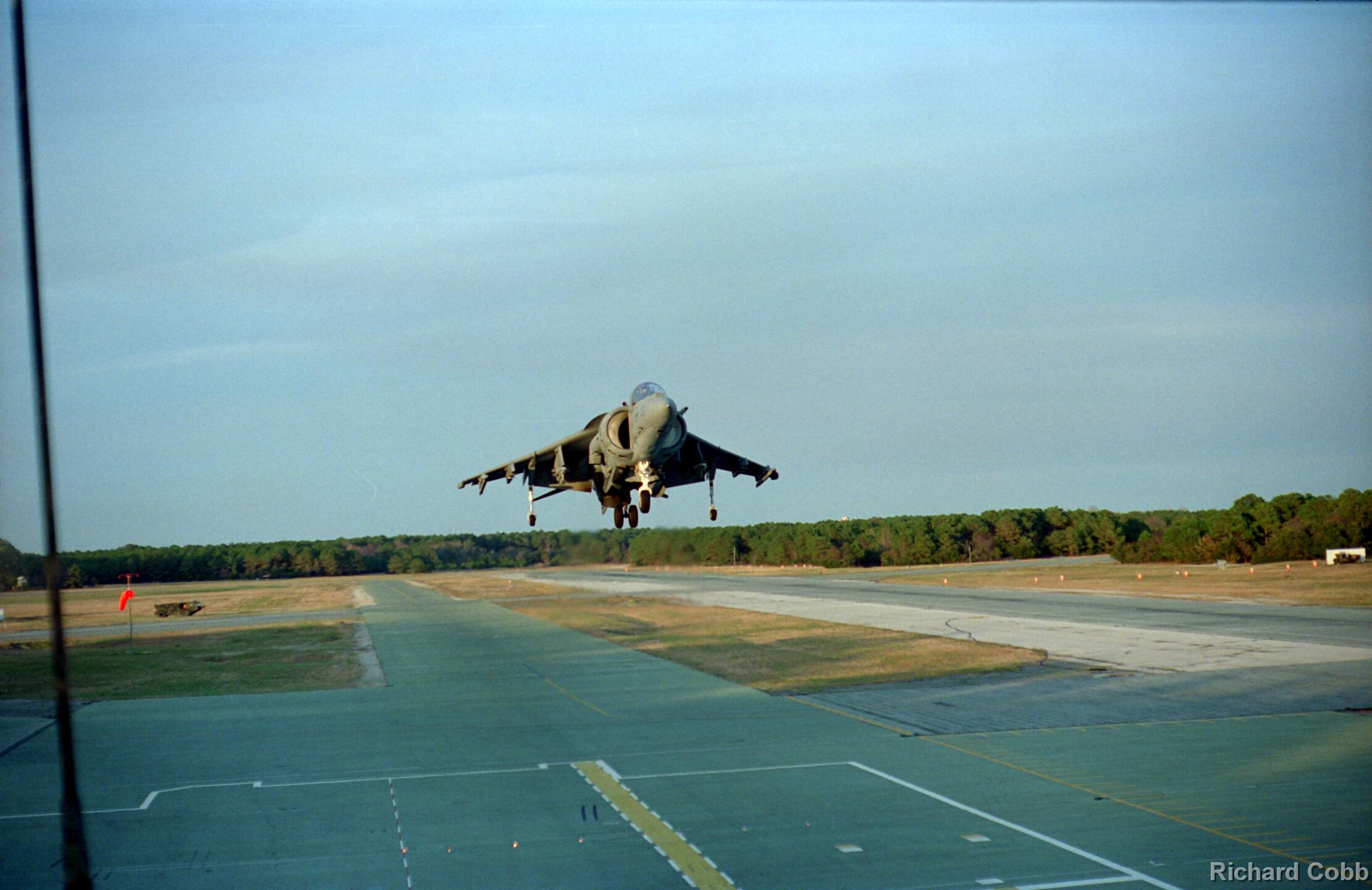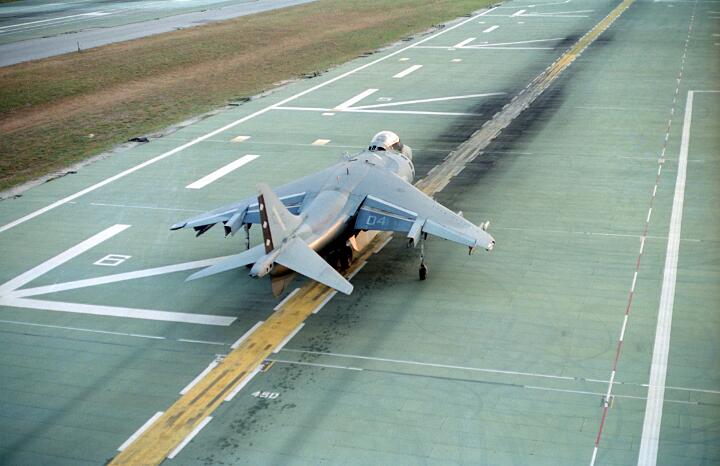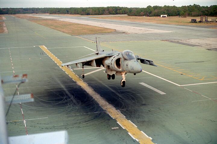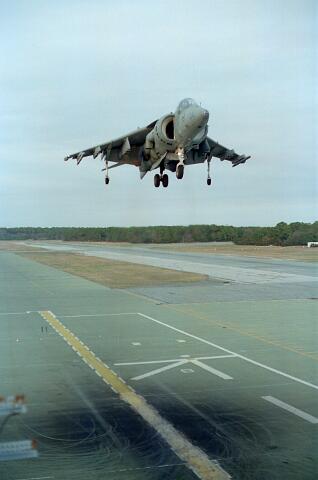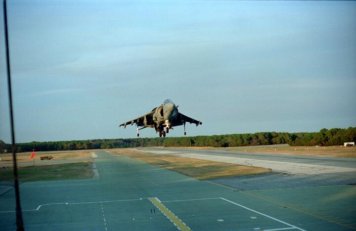 Harrier operations were being conducted during one of the days, and the Harrier photos were taken from a small, portable control tower that had a walkway around the outside. For some of the photos the Harriers were so close that the noise, heat, and kerosene (jet fuel) smell were almost overpowering. Even with double hearing protection (ear plugs + ear muffs) the sound levels were uncomfortably high. But it is very strange to see a jet aircraft hovering stationary just a few feet away from you!