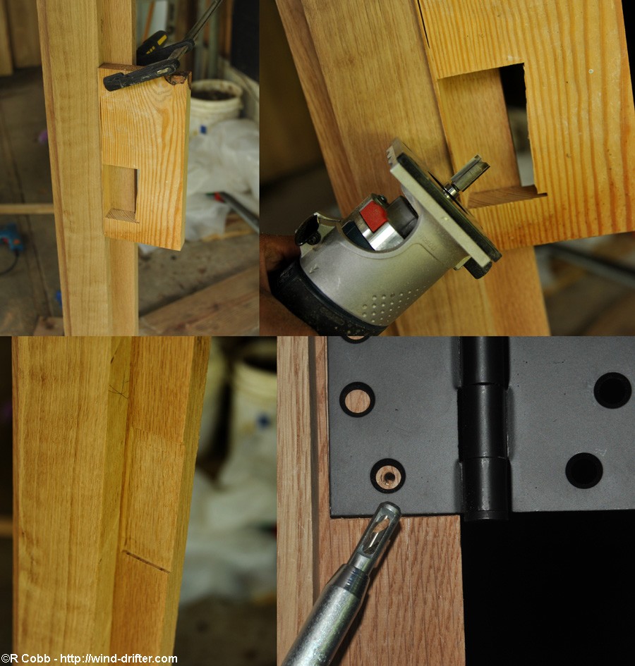 Steve had already bought and delivered some nice hardware, so the next step was mortising the hinges into the door frames. A small trim router, a pattern bit, and a home-made template made this a fairly straight forward (if somewhat nervous) operation. Finally, a self-centering drill bit located the pilot holes for the screws.