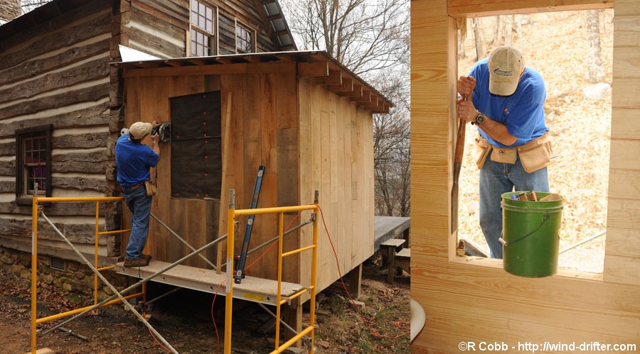 On the day after a customary cabin evening of steaks grilled over an outside fire, Steve and Ed cut and fit the last door on a utility closet.