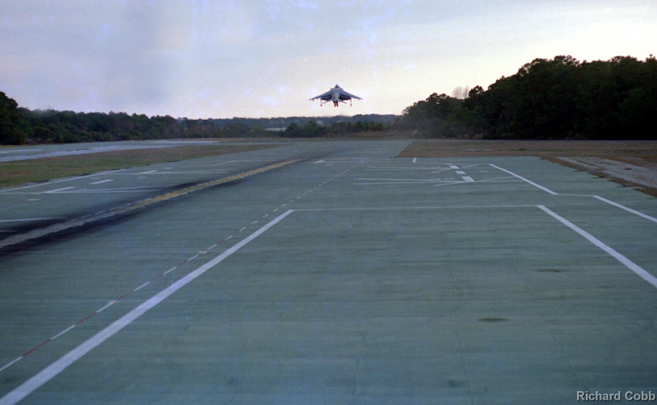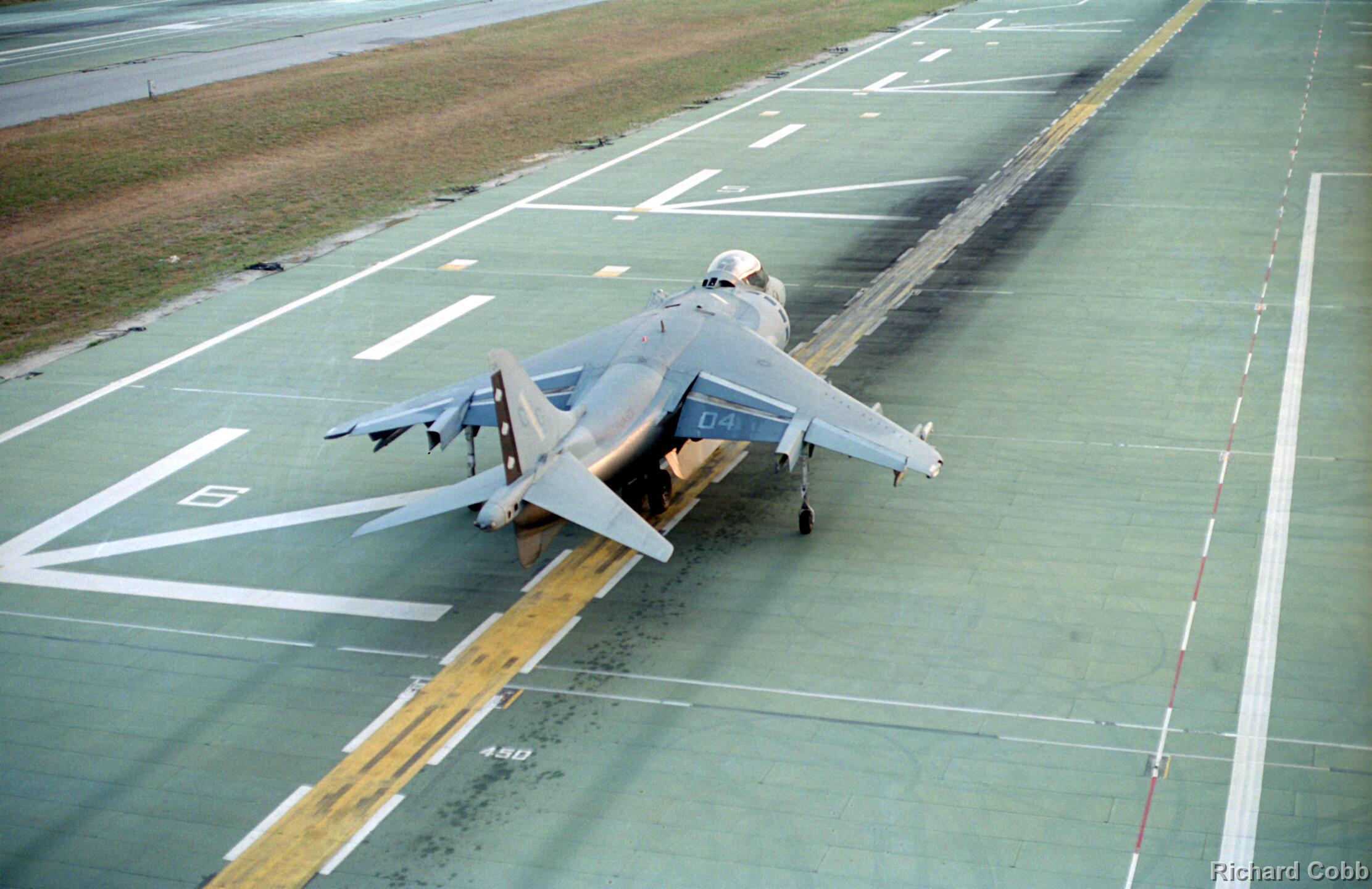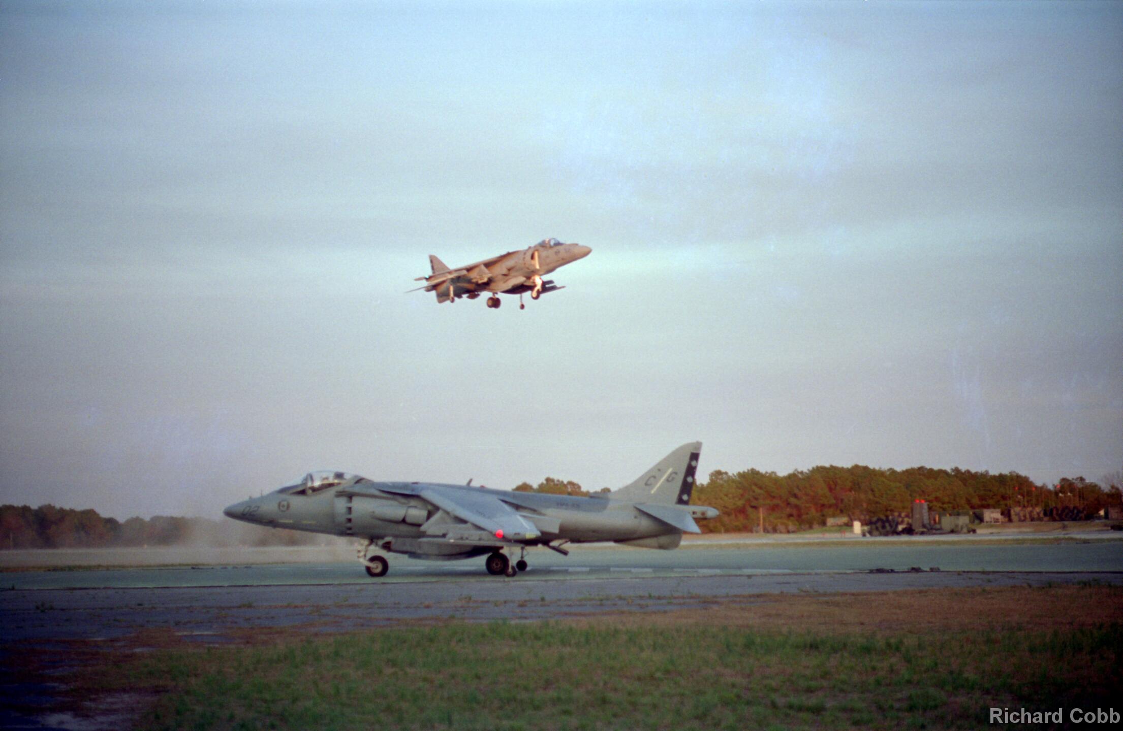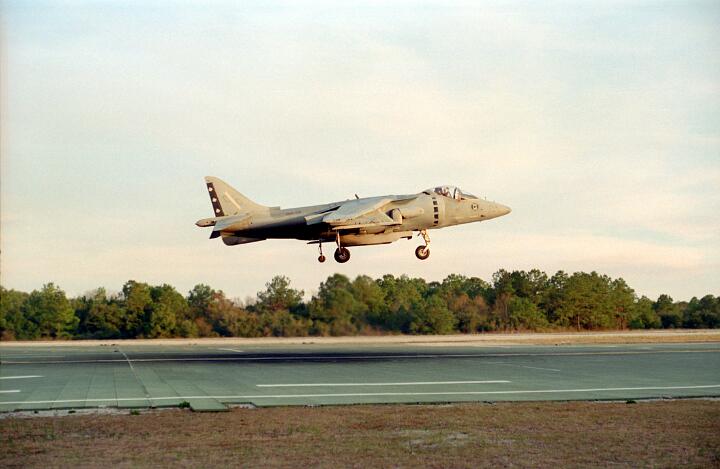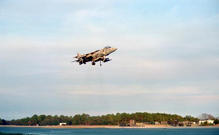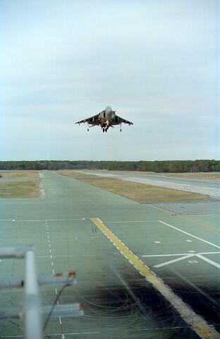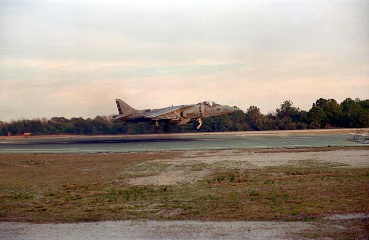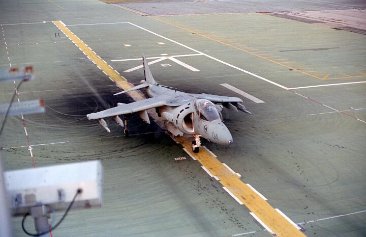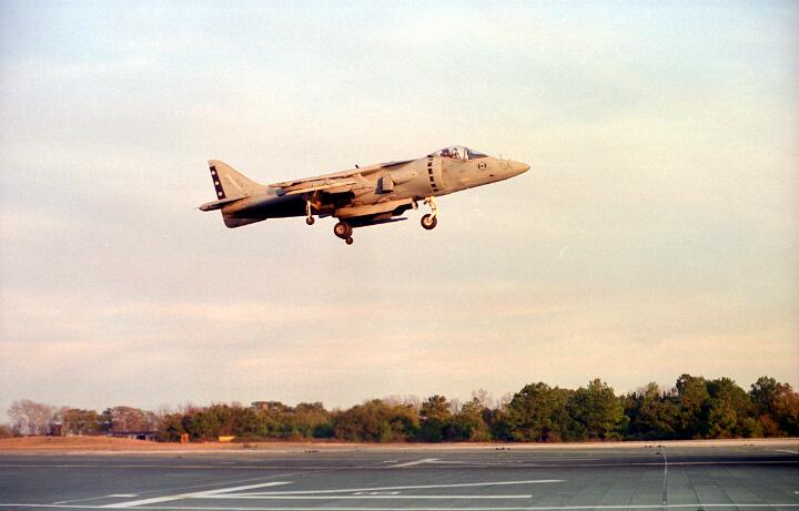 Harrier operations were being conducted during one of the days, and the Harrier photos were taken from a small, portable control tower that had a walkway around the outside. For some of the photos the Harriers were so close that the noise, heat, and kerosene (jet fuel) smell were almost overpowering. Even with double hearing protection (ear plugs + ear muffs) the sound levels were uncomfortably high. But it is very strange to see a jet aircraft hovering stationary just a few feet away from you!