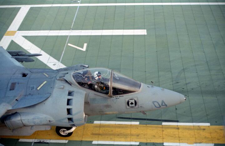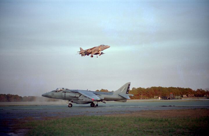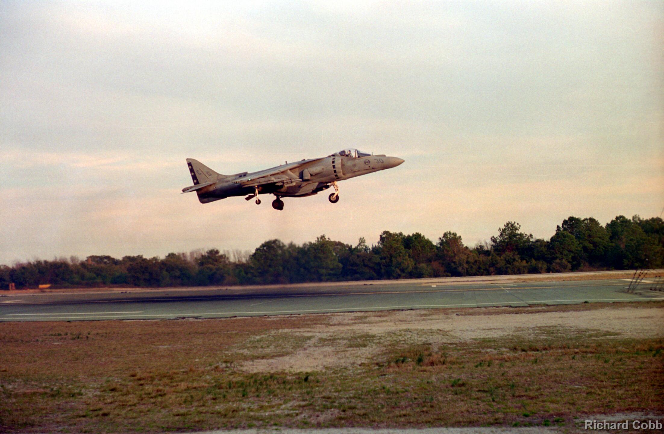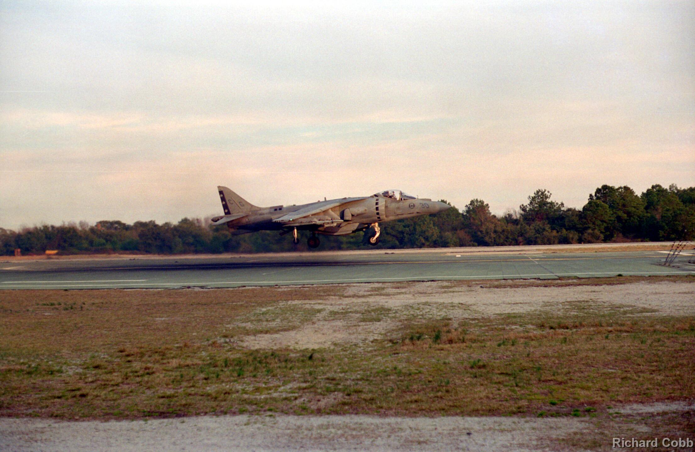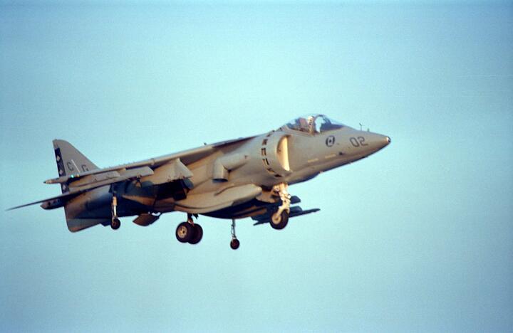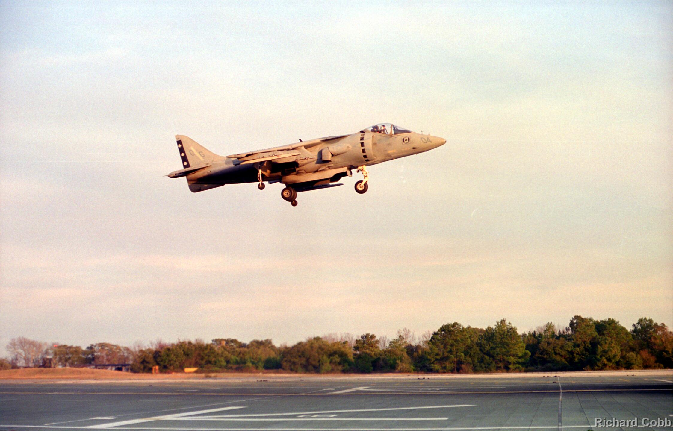 Harrier operations were being conducted during one of the days, and the Harrier photos were taken from a small, portable control tower that had a walkway around the outside. For some of the photos the Harriers were so close that the noise, heat, and kerosene (jet fuel) smell were almost overpowering. Even with double hearing protection (ear plugs + ear muffs) the sound levels were uncomfortably high. But it is very strange to see a jet aircraft hovering stationary just a few feet away from you!