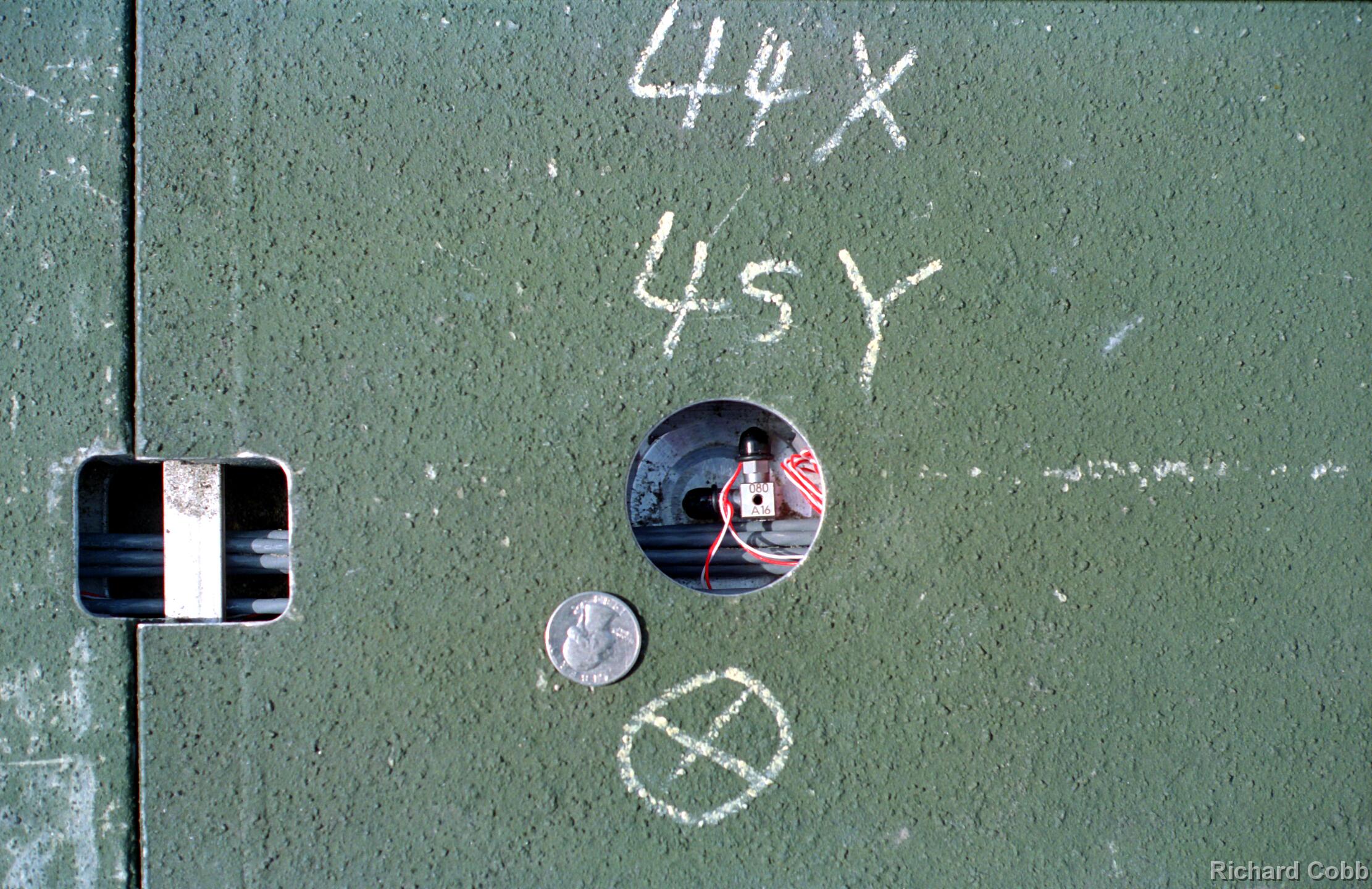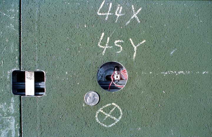 The panels were hollow, and cabling was run inside of the panels. Holes had been drilled in the upper surface at selected locations through which small accelerometers could be installed. Over 50 channels of data was recorded to digital tape. Installing the accelerometers, connecting the cabling and calibrating each accel required between 3 and 4 days, followed by 2 days during which there were multiple C-17 landings and takeoffs